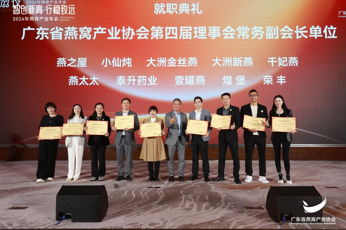大會結(jié)束后,主辦方邀請所有嘉賓共享“金燕滋夜”晚宴,在美酒佳肴中繼續(xù)碰撞智慧思想。宴席期間同步舉行了就職典禮與授牌儀式,燕之屋被授予廣東省燕窩產(chǎn)業(yè)協(xié)會第四屆理事會常務副會長單位、2024年燕窩產(chǎn)業(yè)年會榮耀支持單位以及2024年燕窩產(chǎn)業(yè)年會特約支持單位榮譽,燕之屋公關總監(jiān)楊航上臺領取證書。