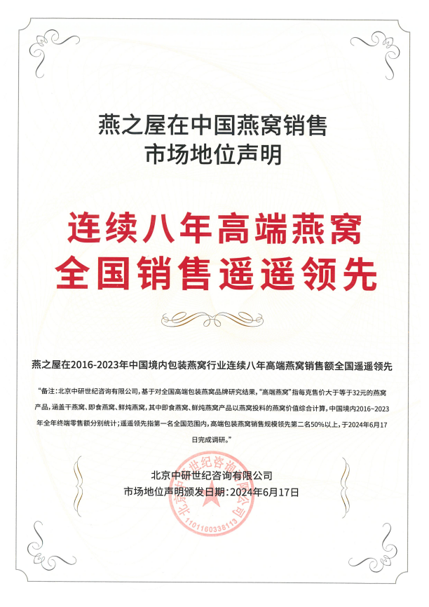 近日,根據(jù)北京中研世紀(jì)咨詢有限公司統(tǒng)計(jì)顯示,燕之屋連續(xù)八年高端燕窩全國銷售第一*(*燕之屋在2016-2023年中國境內(nèi)包裝燕窩行業(yè)連續(xù)八年高端燕窩銷售額全國第一)、燕之屋連續(xù)八年高端燕窩全國銷售遙遙領(lǐng)先*(*燕之屋在2016-2023年中國境內(nèi)包裝燕窩行業(yè)連續(xù)八年高端燕窩銷售額全國遙遙領(lǐng)先),不僅體現(xiàn)了燕之屋硬核的產(chǎn)品力和強(qiáng)大的品牌影響力,也證明了其在燕窩行業(yè)的頭部地位。