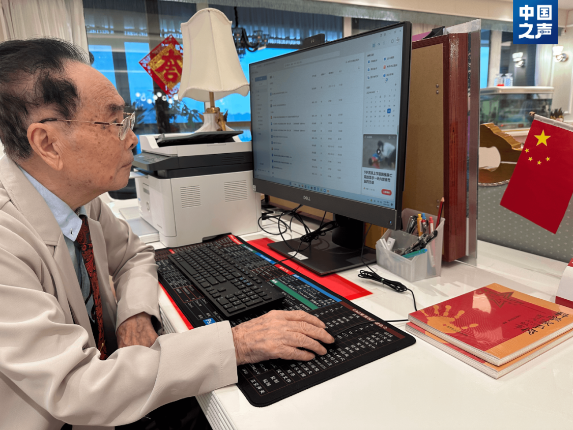圖:95歲的侯云德每天在電腦前學習新知識和進行學術創(chuàng)作