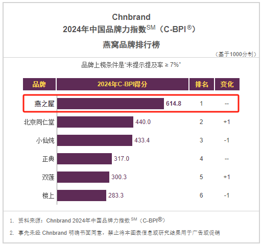 近日,2024年中國品牌力指數(shù)SM(C-BPI®)品牌排名和分析報(bào)告重磅發(fā)布,燕之屋以614.8分的優(yōu)異成績,榮登燕窩品牌排行榜榜首。至此,燕之屋已連續(xù)五年問鼎中國品牌力指數(shù)SM(C-BPI®)燕窩品類榜首。