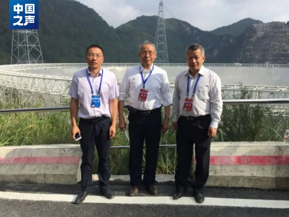 圖:沈世釗(中)和團(tuán)隊成員在落成的“中國天眼”前