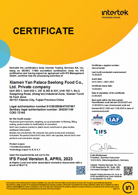 為了響應(yīng)美國(guó)官方的高標(biāo)準(zhǔn)要求,燕之屋分別通過了HACCP食品管理體系認(rèn)證、BRC全球食品安全標(biāo)準(zhǔn)認(rèn)證、IFS國(guó)際卓越標(biāo)準(zhǔn)認(rèn)證和食品出口備案資質(zhì),參加了美國(guó)FDA指定的由中國(guó)檢驗(yàn)檢疫科學(xué)院舉辦的BSPC培訓(xùn),并順利通過考核獲得出口資格,通過了FDA、FCE、SID注冊(cè)。此外,燕之屋更主動(dòng)將產(chǎn)品送至權(quán)威檢測(cè)機(jī)構(gòu)SGS,152項(xiàng)指標(biāo)檢測(cè)全部合格通過,印證燕之屋卓越產(chǎn)品力。2024年10月25日,燕之屋在廈門海關(guān)系統(tǒng)報(bào)檢通關(guān)。之后,燕之屋旗下高品質(zhì)燕窩產(chǎn)品冰糖官燕(60gx6、60gx12)、碗燕·禧孕款(80gx3)、碗燕·尊享款(158gx6)、碗燕·甄愛款(108gx6)、碗燕·濃鮮款(138gx10)通過美國(guó)食品藥品管理局(FDA)審批,順利運(yùn)抵紐約,正式上架開售,為當(dāng)?shù)叵M(fèi)者帶來來自中國(guó)的高端尊貴滋養(yǎng)。